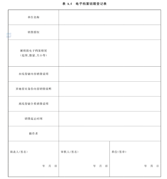 10.3.7應(yīng)填寫(xiě)電子檔案銷(xiāo)毀登記表(見(jiàn)表 A.4)并歸檔保存。