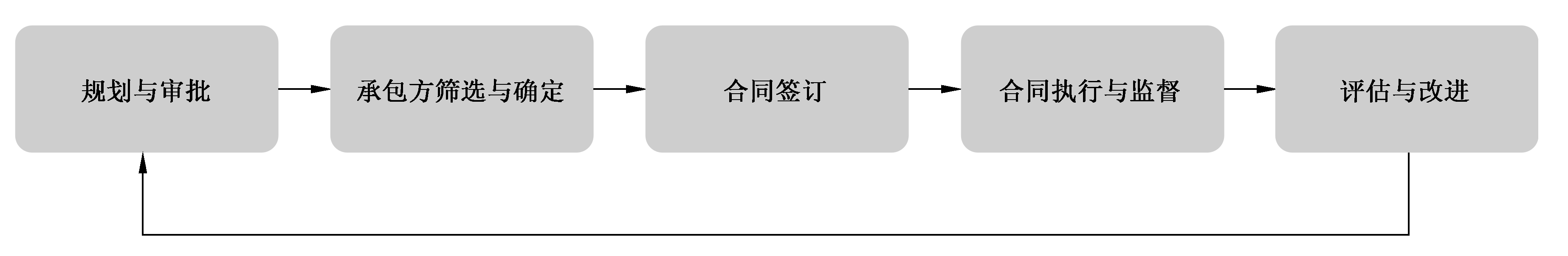 發(fā)包工作可分為規(guī)劃與審批、承包方篩選與確定、合同簽訂、合同執(zhí)行與監(jiān)督、評估與改進(jìn)5個步驟,如圖2所示。