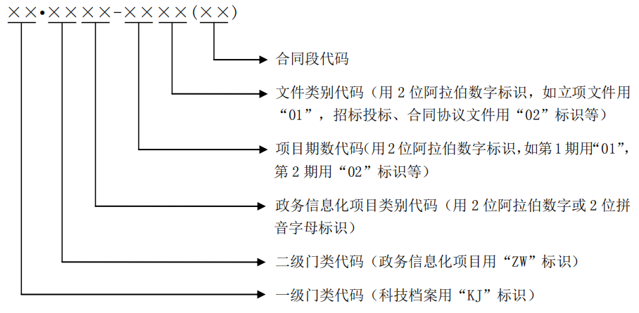 6.2.3.2 檔案門類代碼:可在科技檔案門類“KJ”下設置“政務信息化項目”二級門類,用“政務”拼音首字母“ZW”標識。