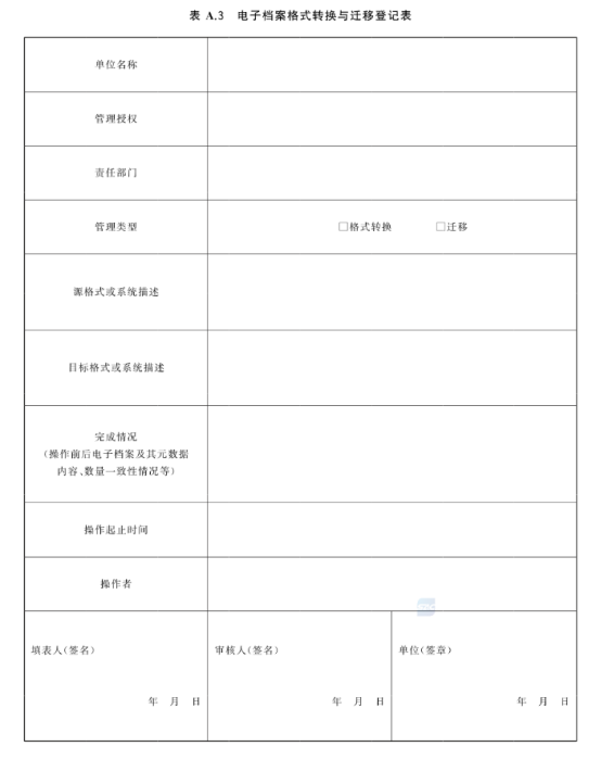 10.2.5 電子檔案及其元數(shù)據(jù)庫(kù)的轉(zhuǎn)換、遷移活動(dòng)應(yīng)記錄于電子檔案管理過(guò)程元數(shù)據(jù)中,并填寫(xiě)電子檔案格式轉(zhuǎn)換與遷移登記表(見(jiàn)表 A.3)。