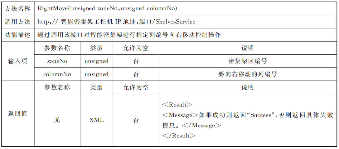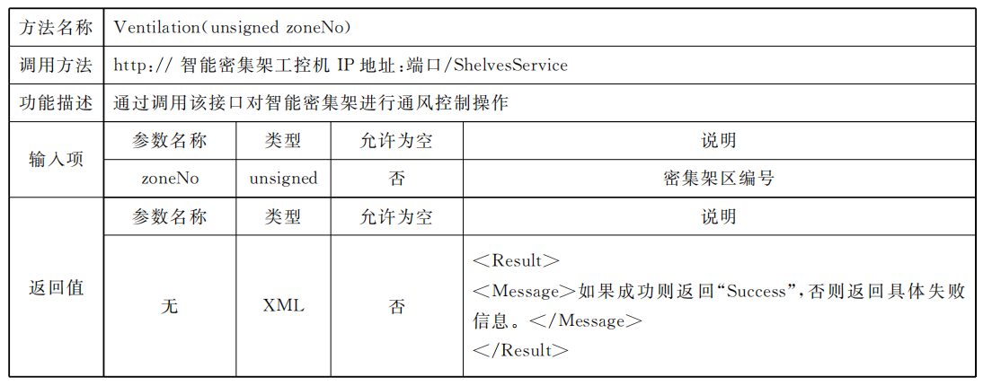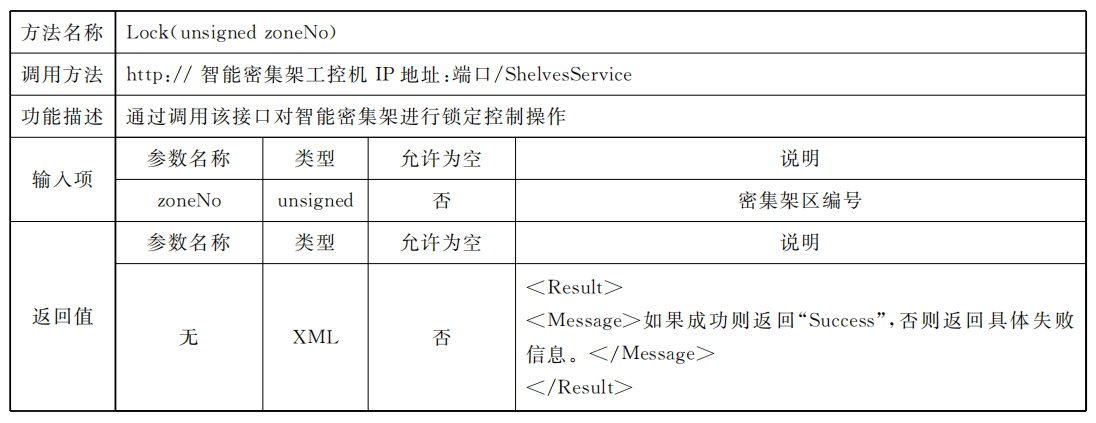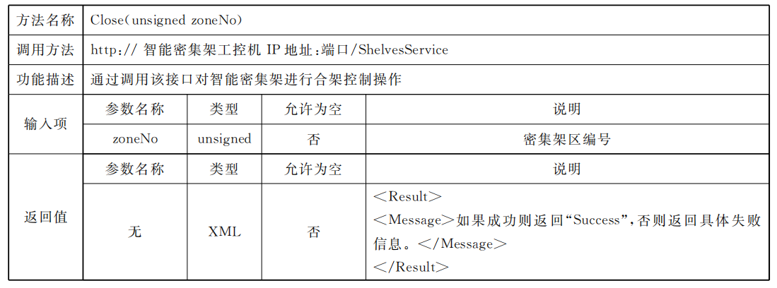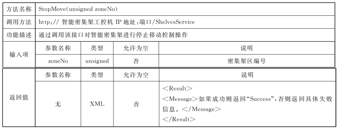 密集架控制系統(tǒng)應(yīng)同時具備總線協(xié)議方式以及Web Service協(xié)議方式,供外部設(shè)備或外部應(yīng)用進(jìn)行調(diào)用總線協(xié)議標(biāo)準(zhǔn)采用RS485接口,通過區(qū)域控制總線進(jìn)行通信,但不排除同時使用其他總線通信方式的可能,總線通信協(xié)議見附錄A;Web Service通信應(yīng)滿足數(shù)據(jù)傳輸安全要求,網(wǎng)絡(luò)通信協(xié)議見附錄B。