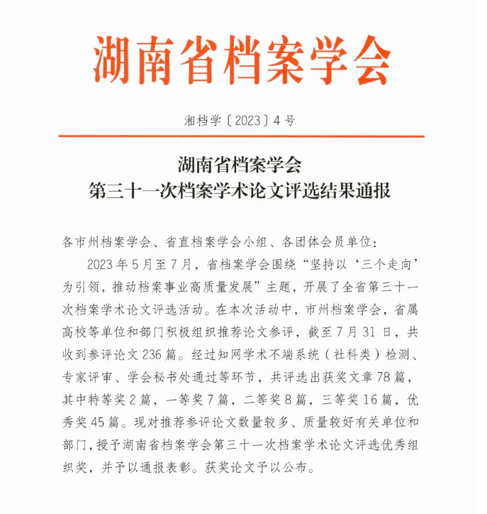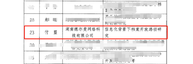 2023年5月至7月,湖南省檔案學(xué)會圍繞“堅持以“三個走向’為引領(lǐng),推動檔案事業(yè)高質(zhì)量發(fā)展”主題,開展了全省第三十一次檔案學(xué)術(shù)論文評選活動。在本次活動中,湖南德爾斐科技總經(jīng)理付盟撰寫的《信息化背景下檔案開放路徑研究》論文,榮獲優(yōu)秀獎。
